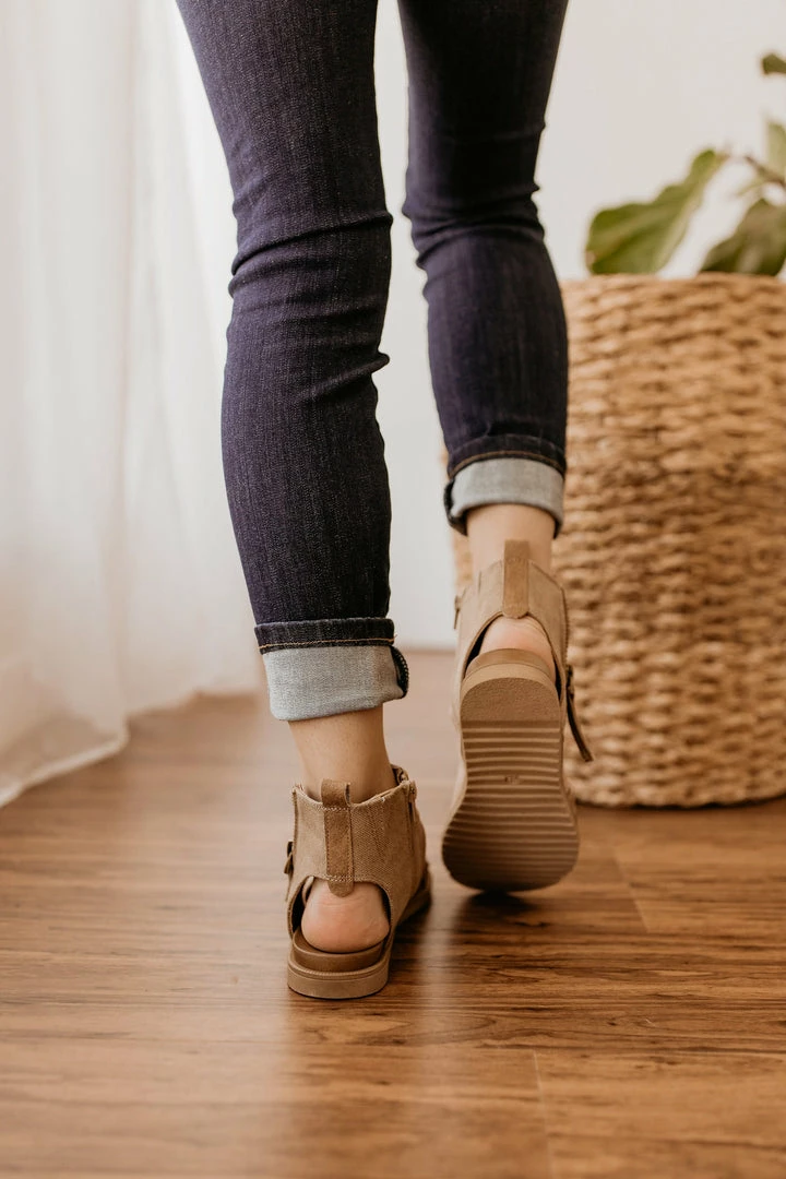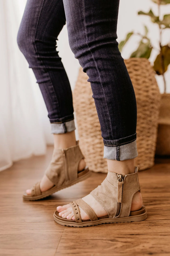 A modern spin on the gladiator! This tan sandal features an ankle shaft with full zip and studded toe straps.