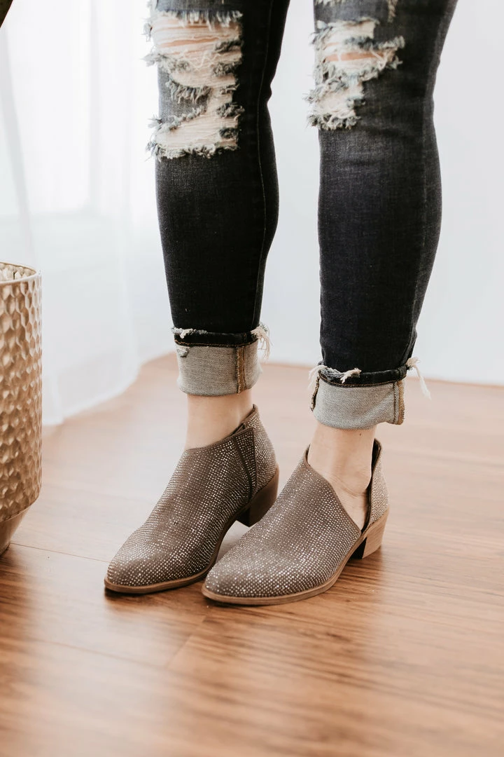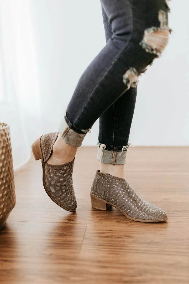 A remake of one of our top sellers from last year! This rich taupe shoe features an open ankle and is covered is crystals! There perfect pairing for you skinnies or leggings!