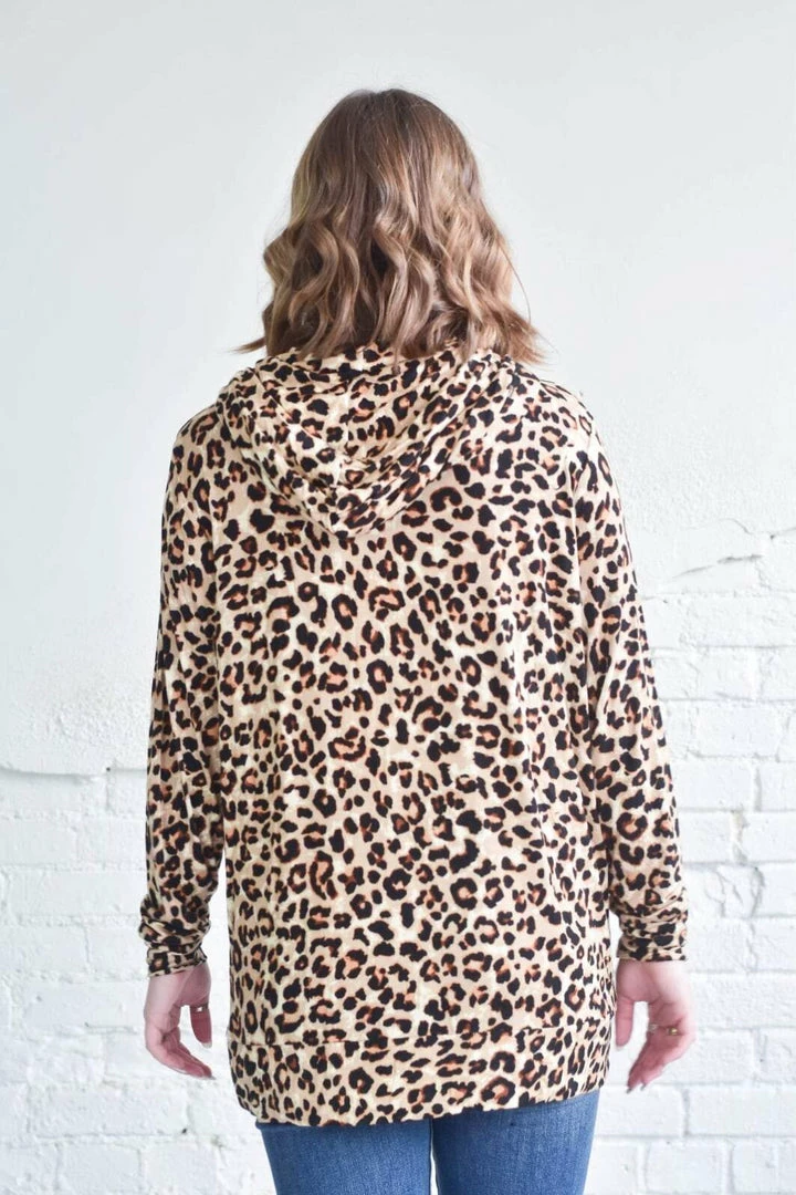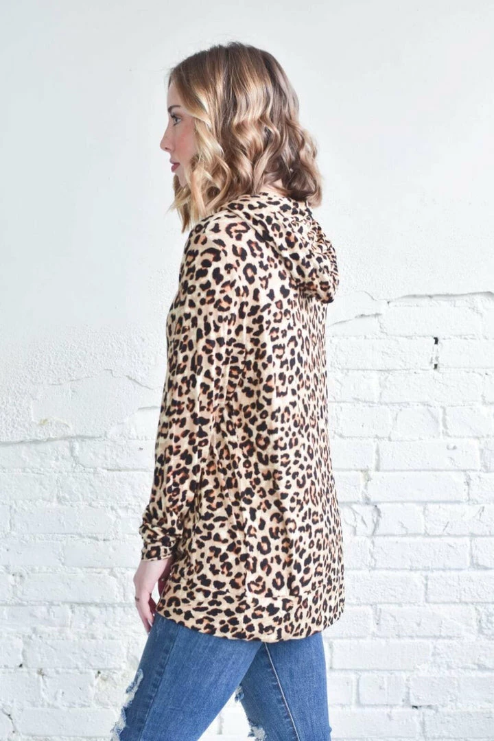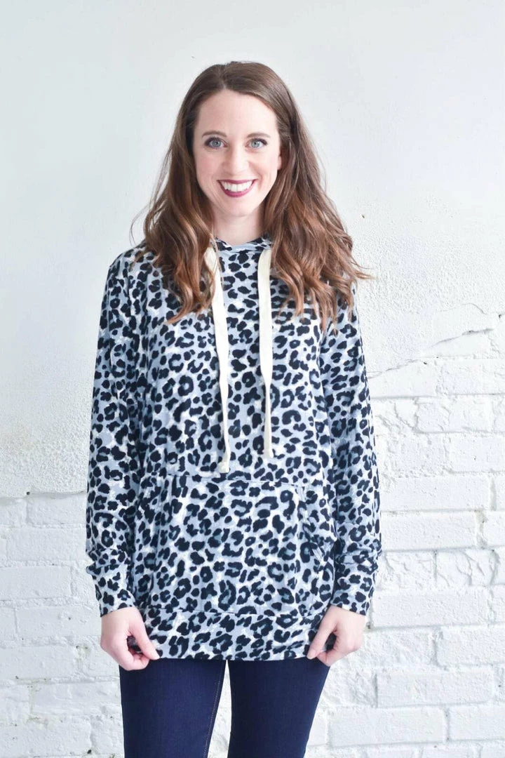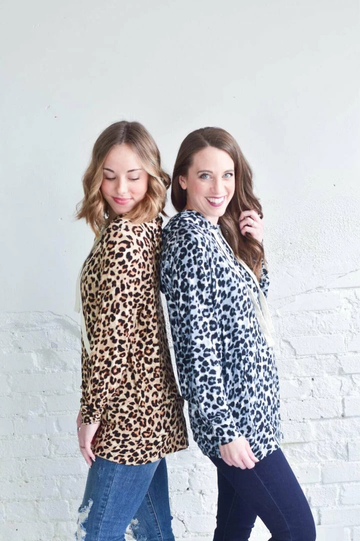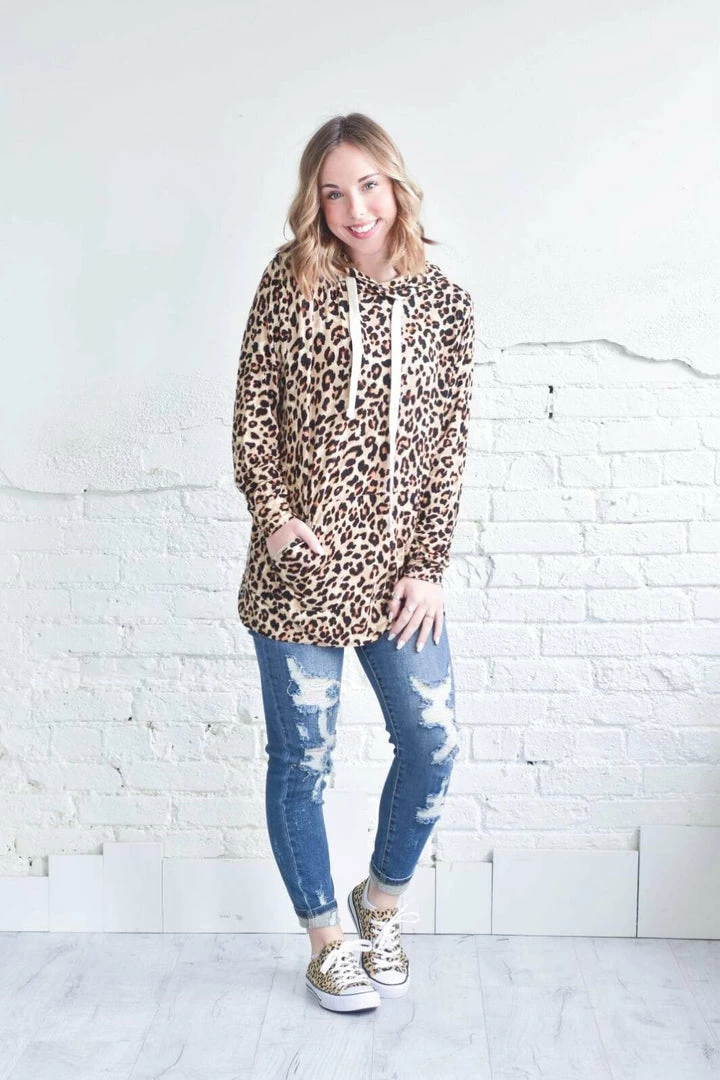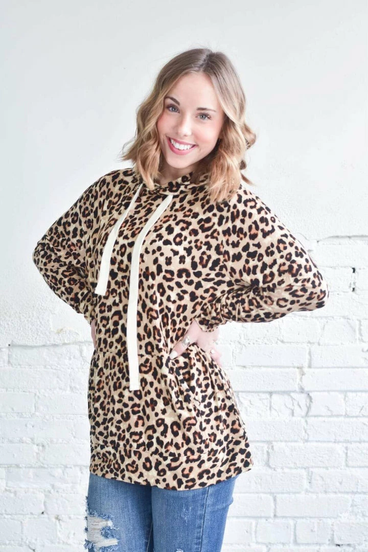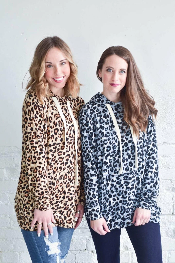 This leopard print hoodie is the so soft and stretchy you can relax in it or throw it on with denim to do just about anything! It also features a Kangaroo pocket in 2 different color ways!