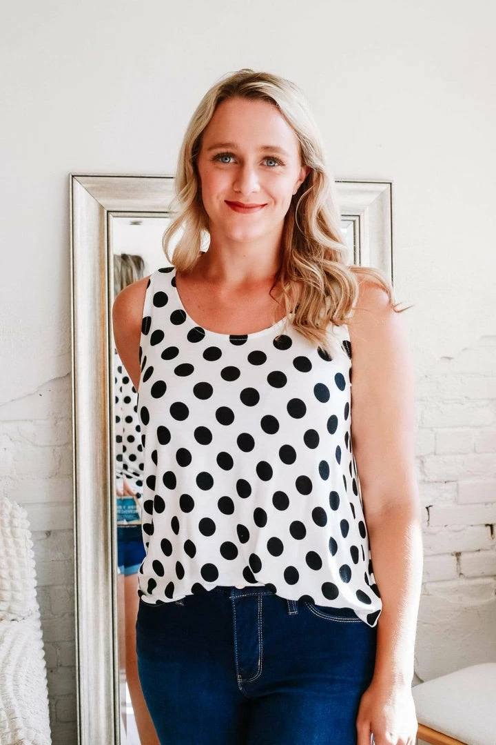 If polka dots are your jam, we have the perfect, must-have it tank for you. This one is absolutely adorable and we know it will be a favorite of yours this season. We especially love it paired with our Faux Leather Paperbag shorts!