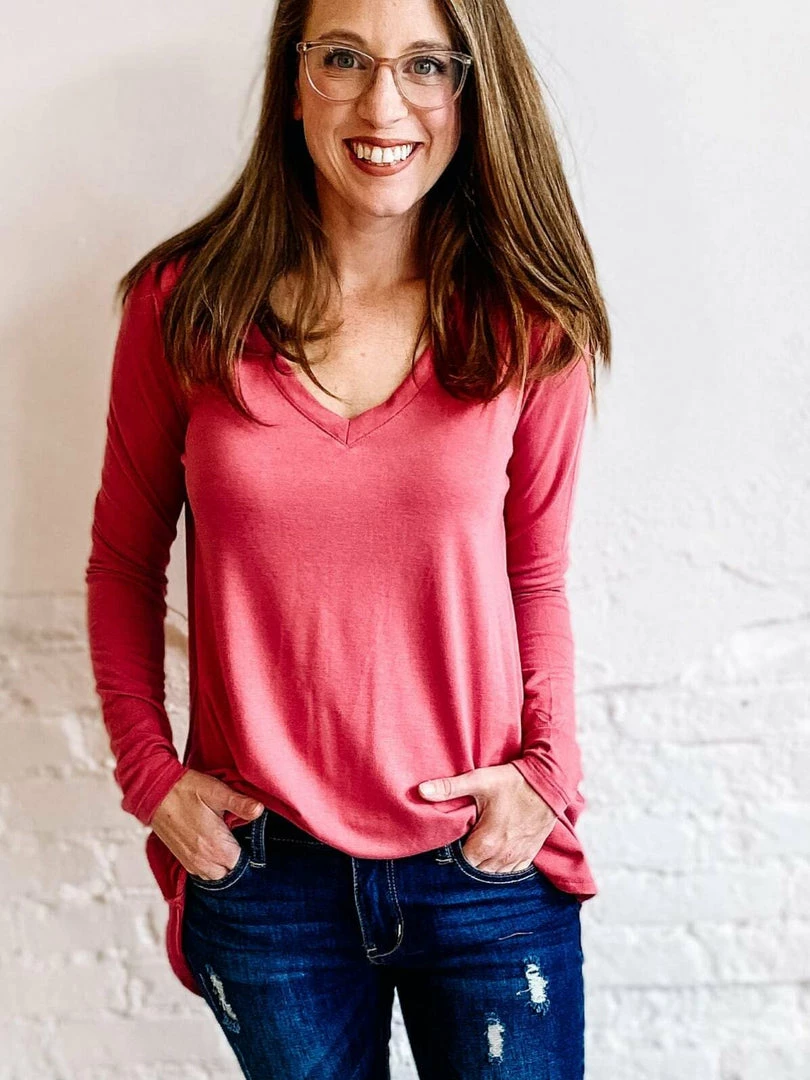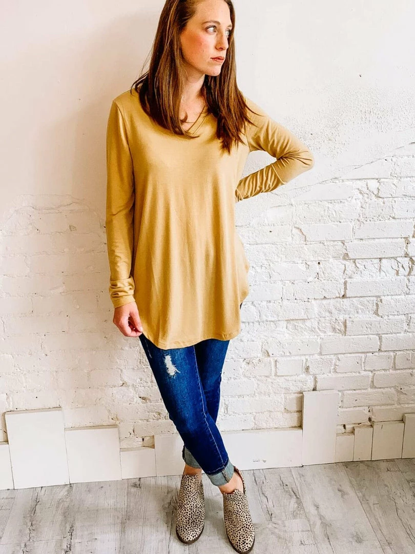 You all know and love our Luxe tee!!! And here we have it with Long sleeves!!! V neck, round hem for a front tuck or to wear with Leggings. This is the exact same top as our Luxe tee but with long sleeves!!!
